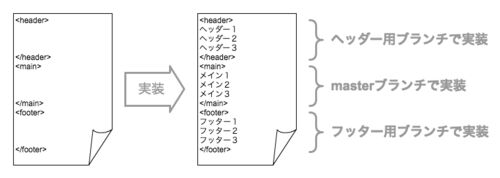ブランチを使ってHTMLを実装するような想定で、Gitのブランチ/マージを試してみる。